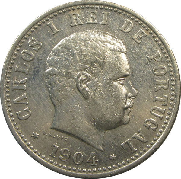 Legend: CARLOS I REI DE PORTUGAL with 1904 in the bottom. Initials V.ALVES for the engraver: Valancio Alves as raised inscriptions below the neck