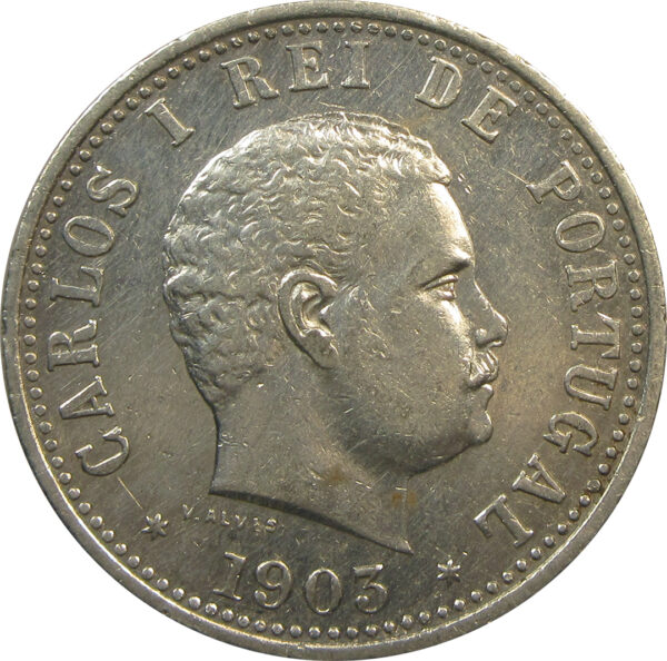 Legend: CARLOS I REI DE PORTUGAL with 1903 in the bottom. Initials V.ALVES for the engraver: Valancio Alves as raised inscriptions below the neck