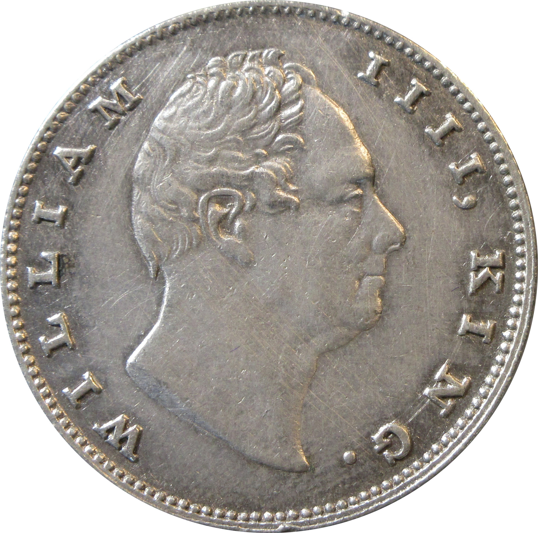 Obverse: Bear head of King William IV facing right with Legends WILLIAM IV, KING. around it.