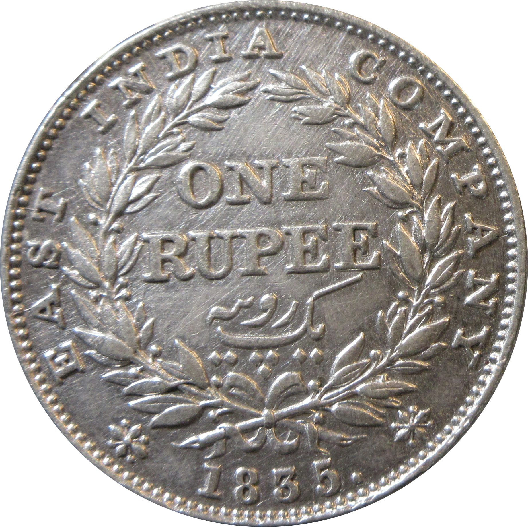 Reverse: ONE RUPEE/Yek Rupya surrounded by a wreath of laurel. Surrounded by the legend “EAST INDIA COMPANY 1835”