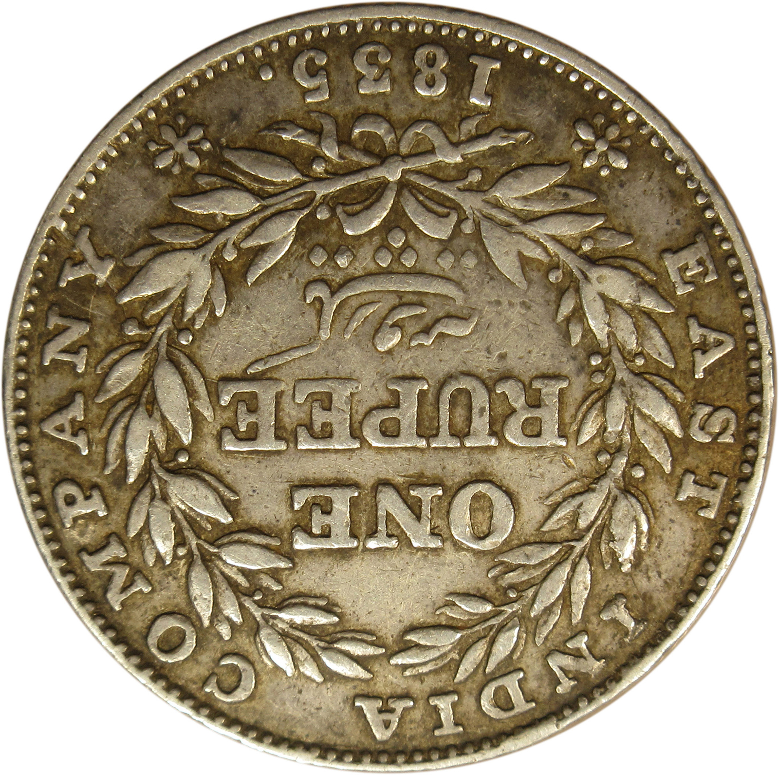 Reverse:Â ONE RUPEE/Yek Rupya surrounded by a wreath of laurel. Surrounded by the legend “EAST INDIA COMPANY 1835”
