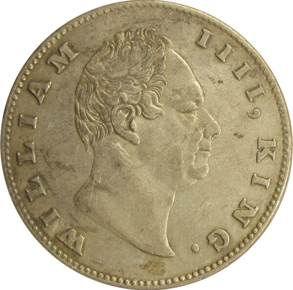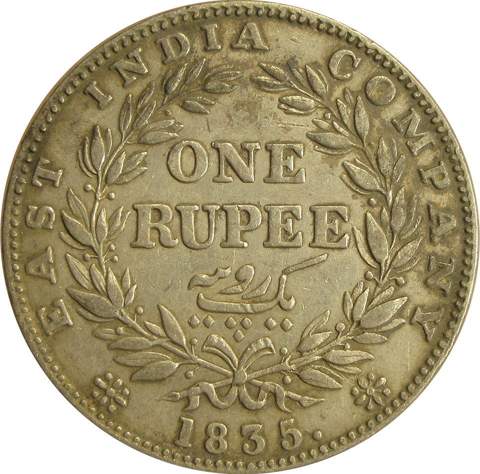 Reverse:Â ONE RUPEE/Yek Rupya surrounded by a wreath of laurel. Surrounded by the legend “EAST INDIA COMPANY 1835”