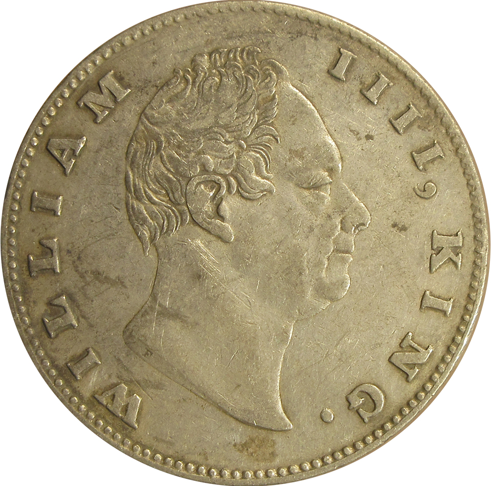 Obverse:Â Bear head of King William IV facing right with Legends WILLIAM IV, KING. around it.