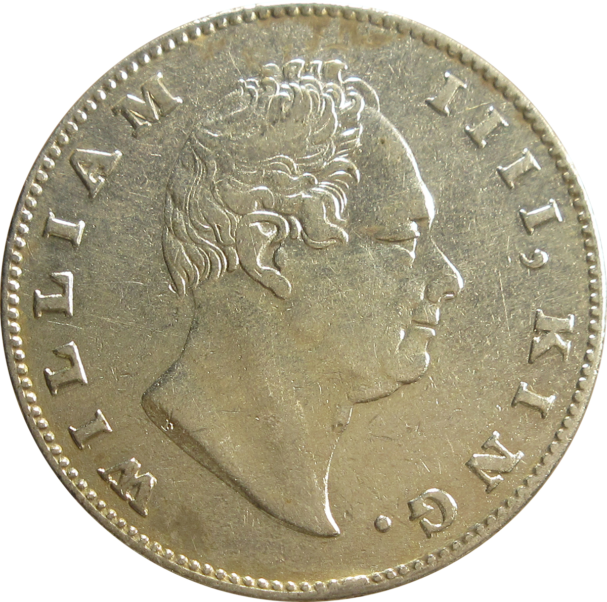 Obverse:Â Bear head of King William IV facing right with Legends WILLIAM IV, KING. around it. Truncation of Raised ‘F’ on the left of the neck.