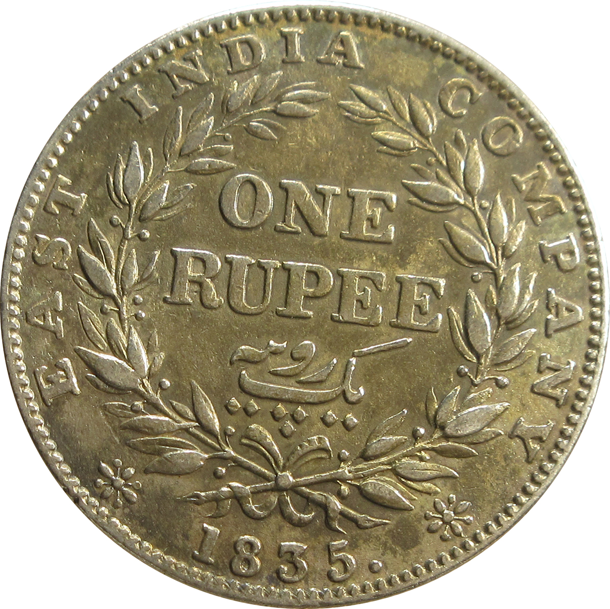 Reverse:Â ONE RUPEE/Yek Rupya surrounded by a wreath of laurel. Surrounded by the legend “EAST INDIA COMPANY 1835”