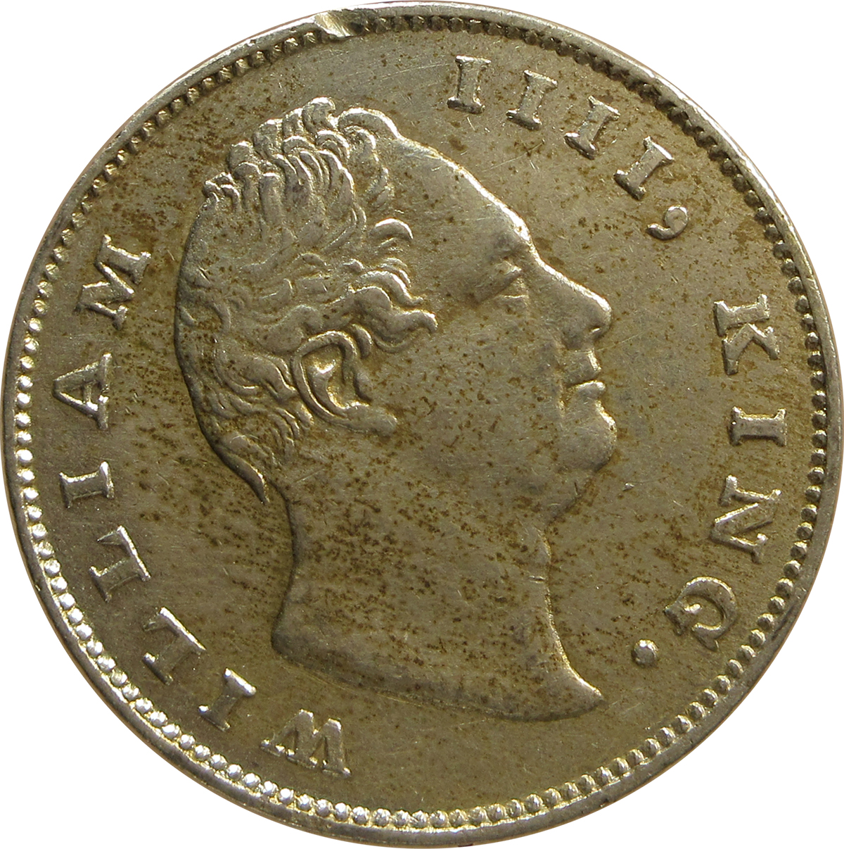 Obverse:Â Bear head of King William IV facing right with Legends WILLIAM IV, KING. around it. Truncation of Raised ‘F’ on the left of the neck.