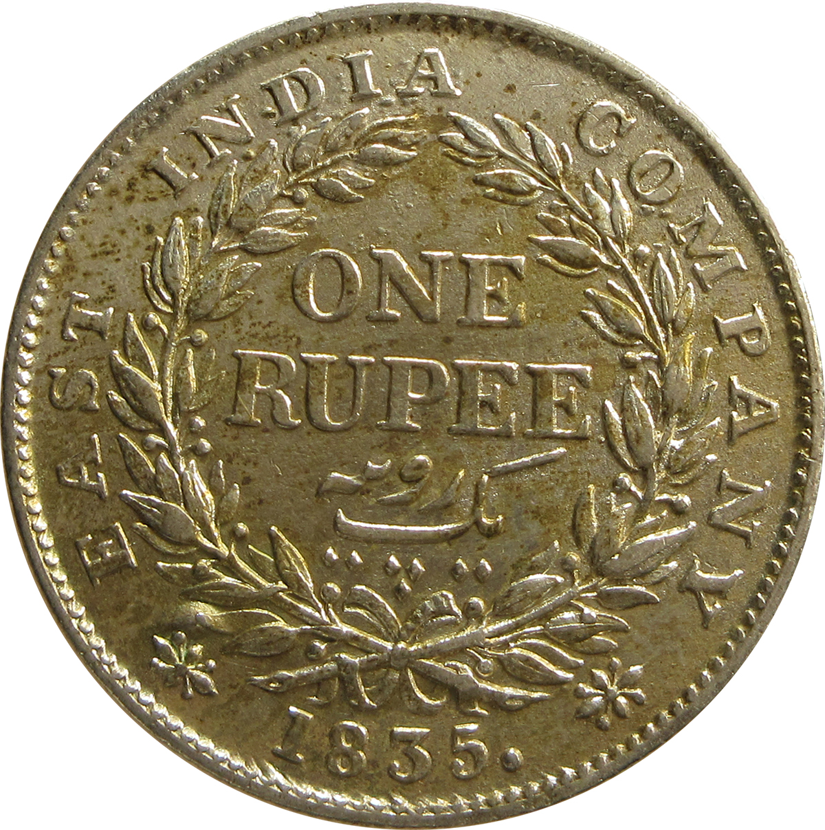 Reverse:Â ONE RUPEE/Yek Rupya surrounded by a wreath of laurel. Surrounded by the legend “EAST INDIA COMPANY 1835”