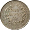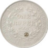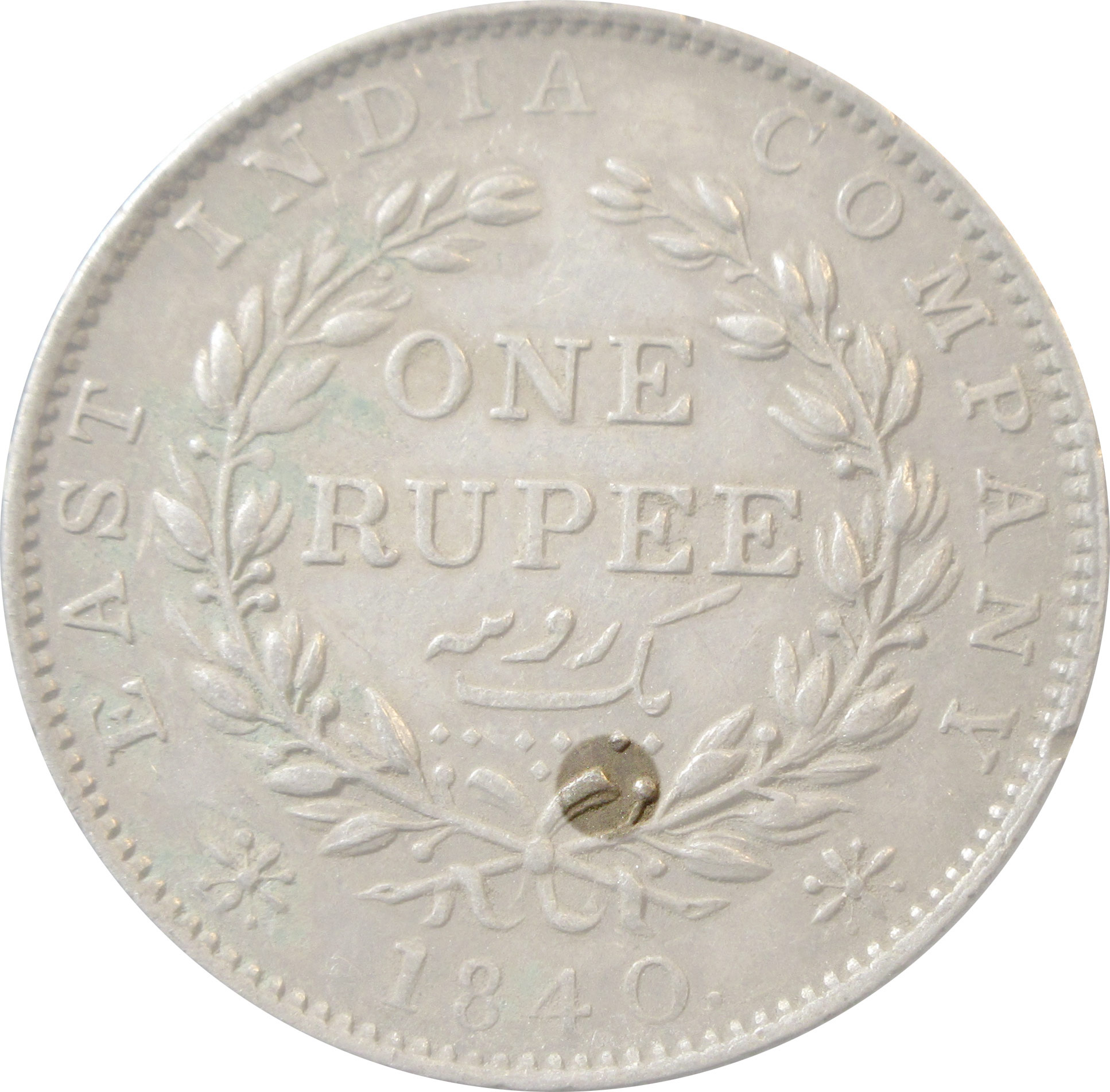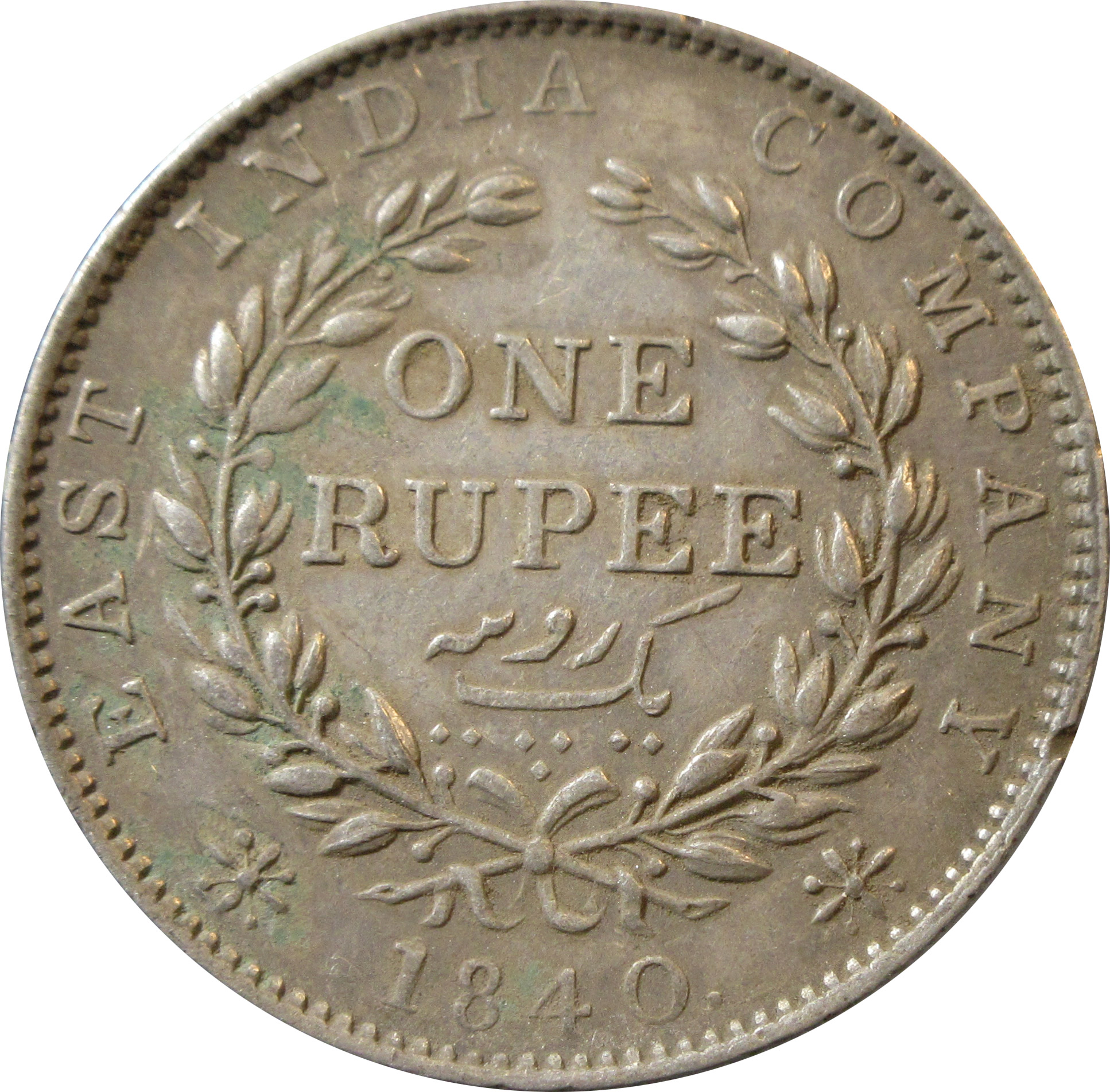 Reverse:Â One Rupee/Yek Rupiya, within a wreath of laurel. The value in English and Persian; all within a raised ,toothed border. Around this is the legend “EAST INDIA COMPANY 1840”