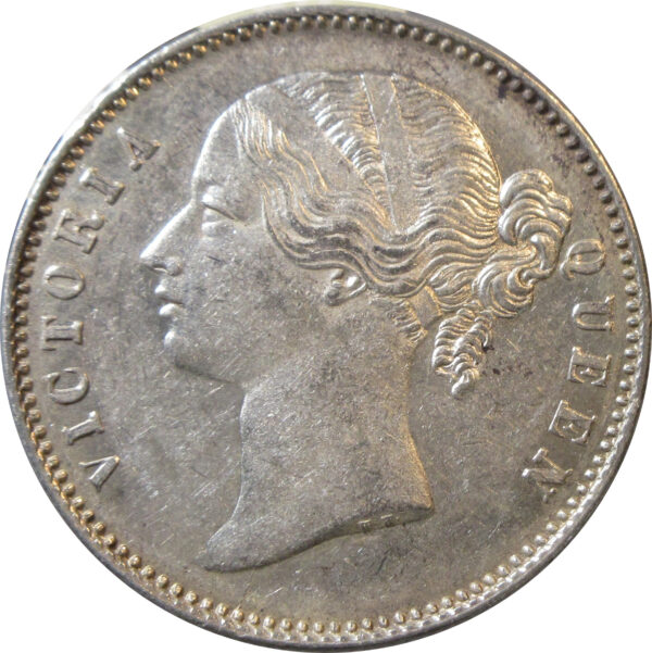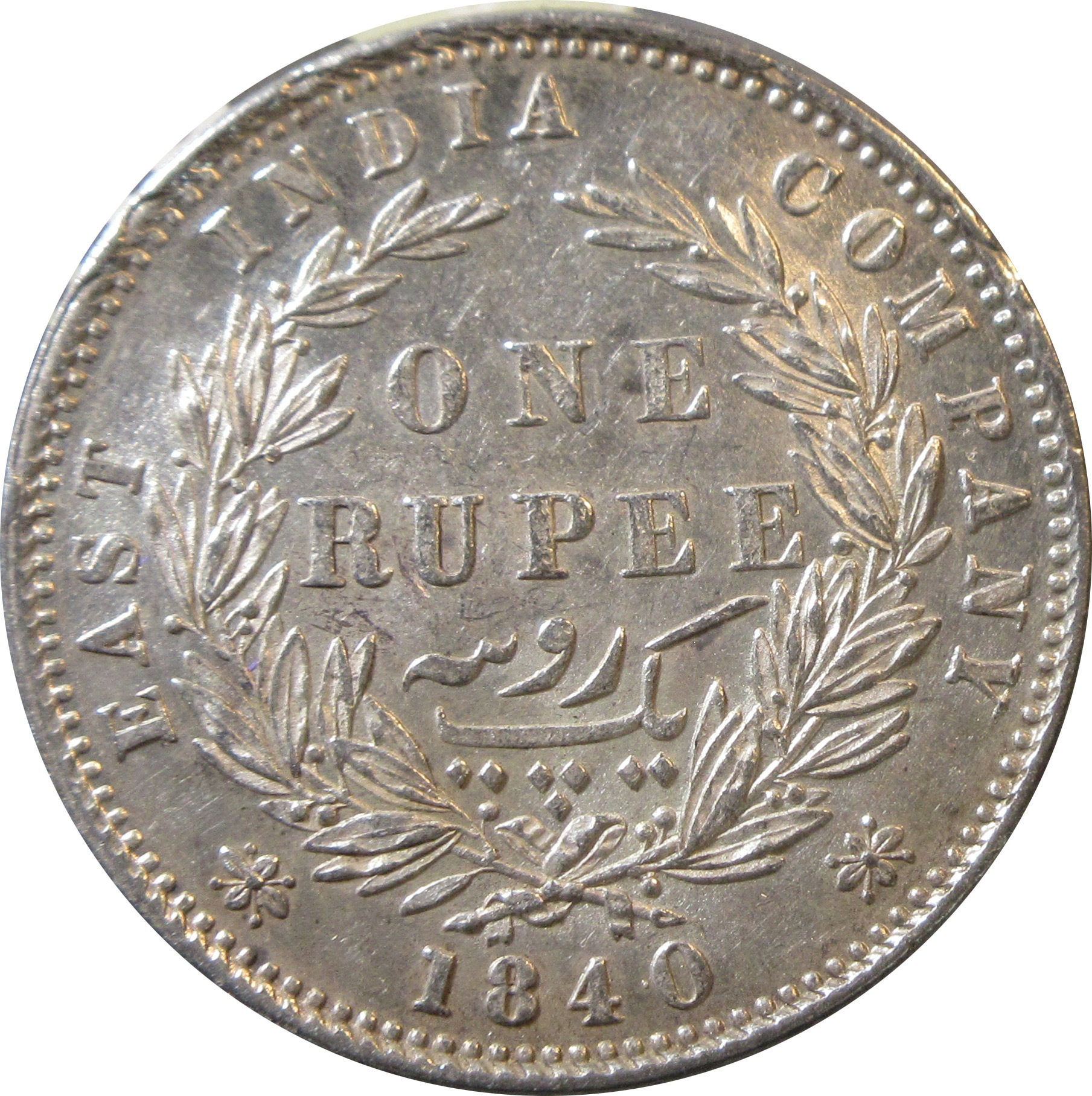 Reverse: ONE RUPEE/Yek Rupia (Persian) within a wreath of laurel. The value in English and Persian; all within a raised, toothed border. Around this is the legend and date “EAST INDIA COMPANY 1840”