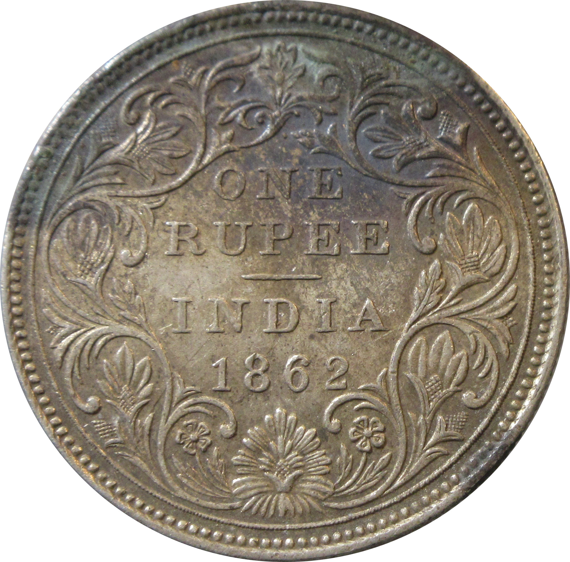 Reverse: ONE RUPEE/INDIA/1862 within scroll like Indian Flora wreath. All within a toothed raised rim.
