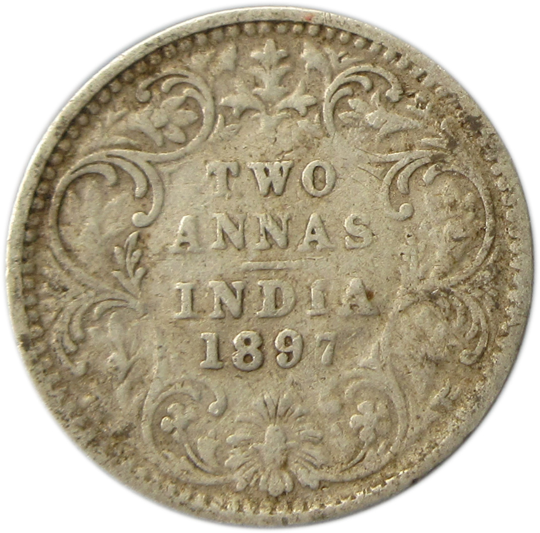 Reverse: TWO ANNAS/INDIA/1897 within scroll-like wreath of Indian flora. All within a raised, toothed border.