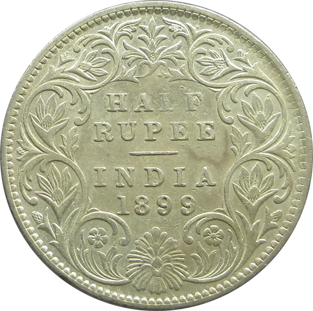 Reverse: HALF RUPEE/INDIA/1899 within scroll-like wreath of Indian flora. All within a raised, toothed border.