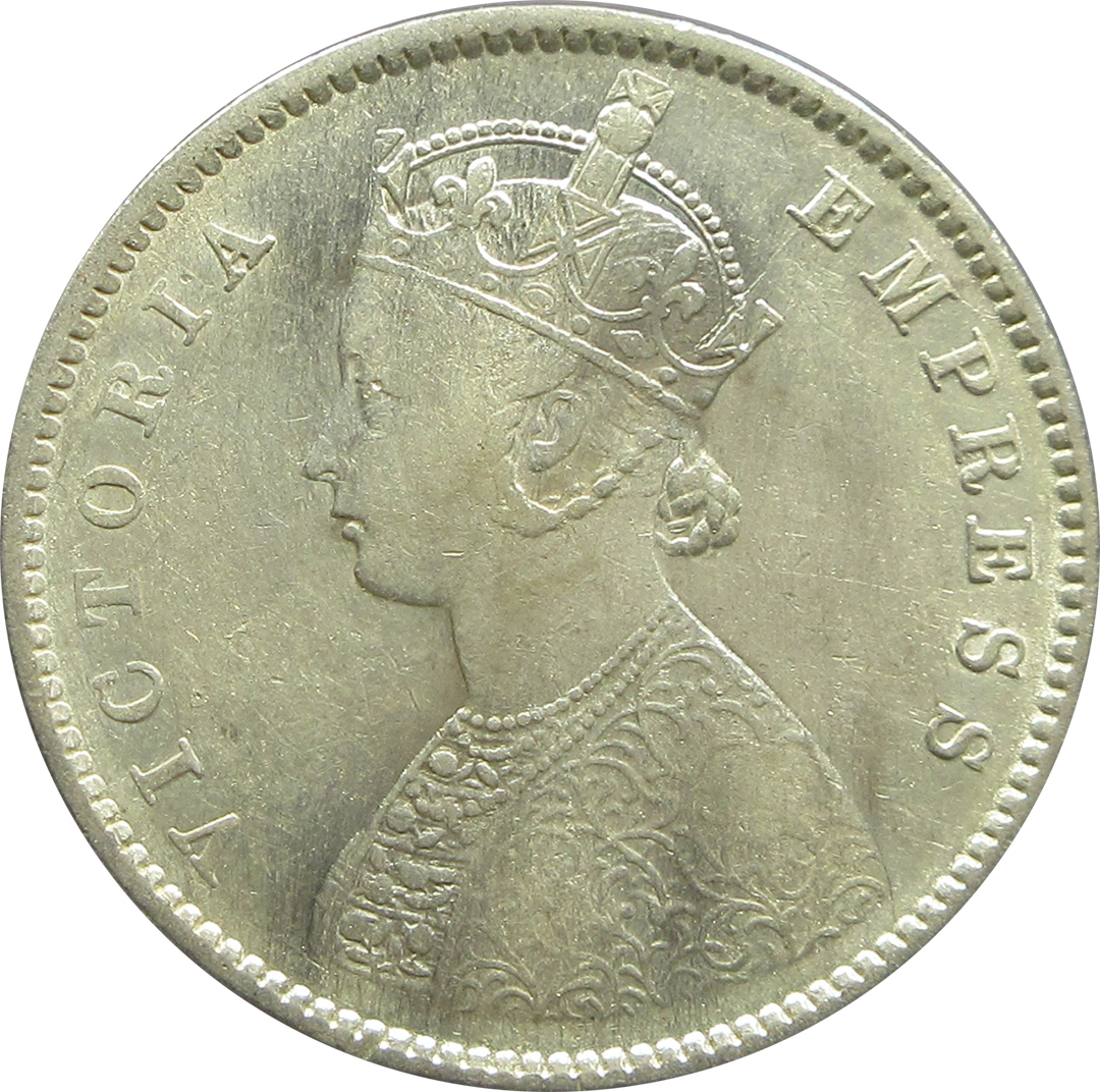 Obverse: Crown and Ornamental robed bust of Empress Victoria facing left surrounded with legend VICTORIA EMPRESS. All within a raised, toothed border.
