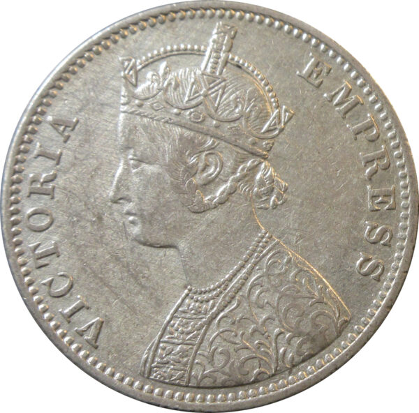 Obverse: Crown and Ornamental robed bust of Empress Victoria facing left surrounded with legend VICTORIA EMPRESS. All within a raised, toothed border.