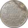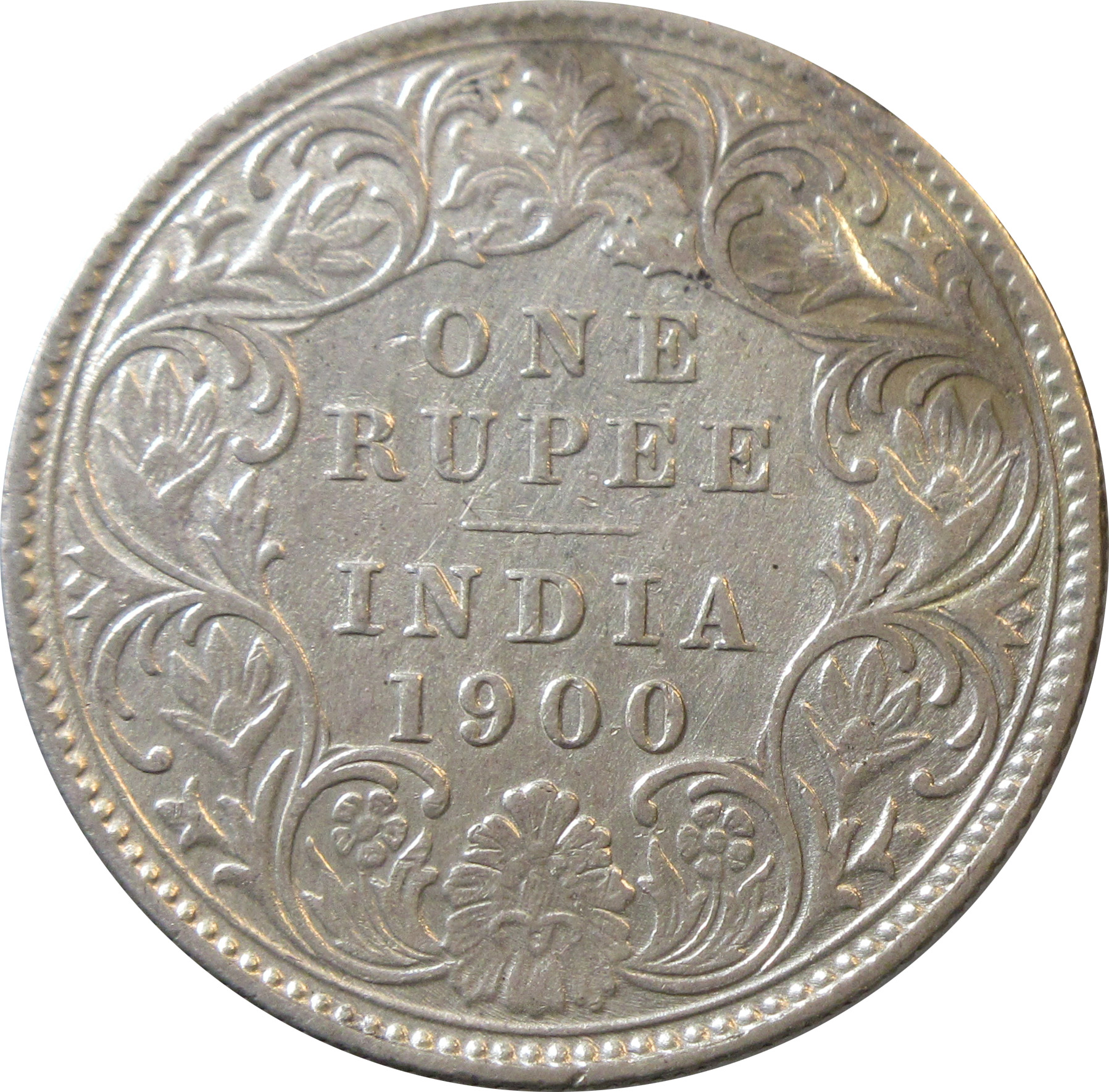 Reverse: ONE RUPEE/INDIA/1901 within scroll-like wreath of Indian flora. All within a raised, toothed border.