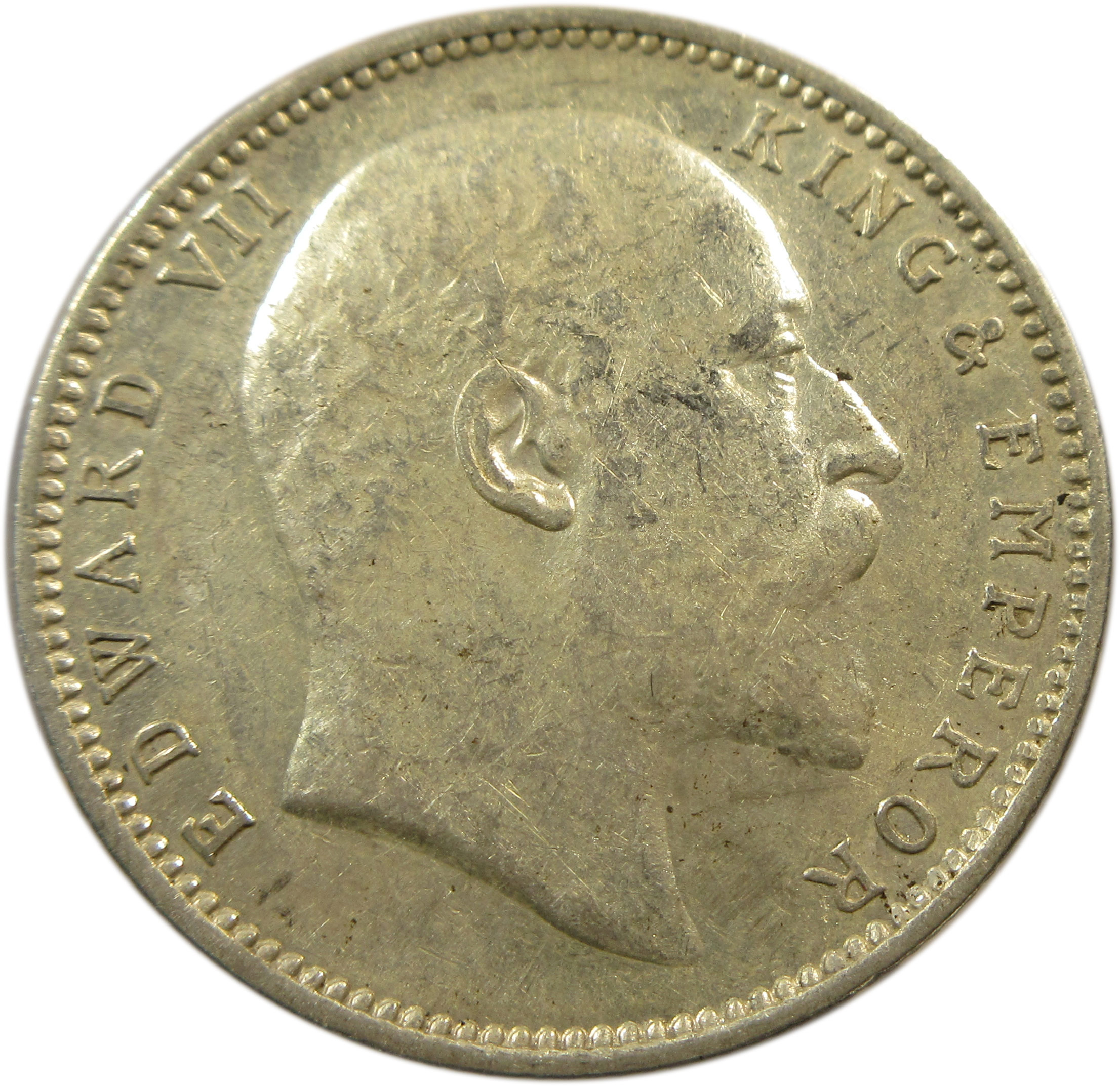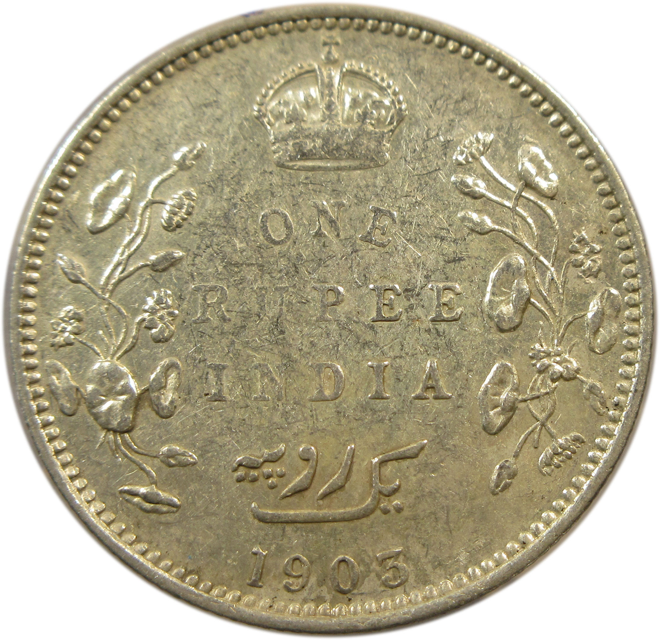 Reverse: Crown/1 RUPEE/INDIA/Yek Rupiya(1 Rupee in Urdu)/1903, surrounded by a spray of a Lotus flora in each side. The value in English and Persian; all within a raised ,toothed border.