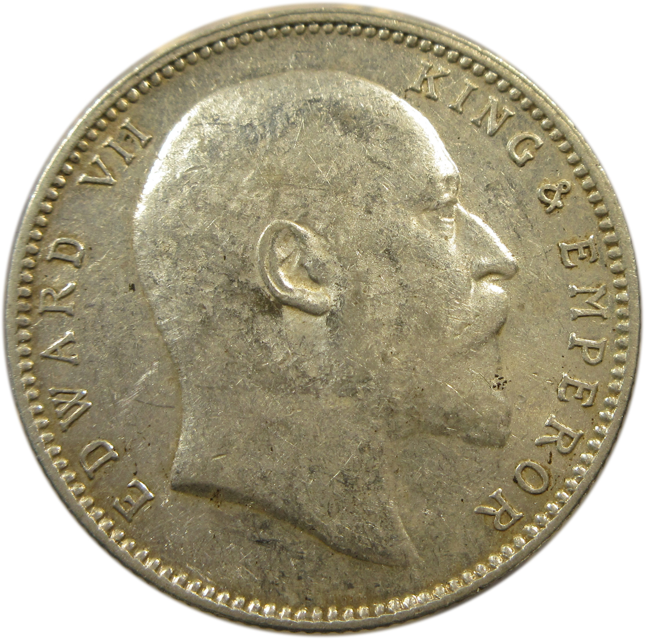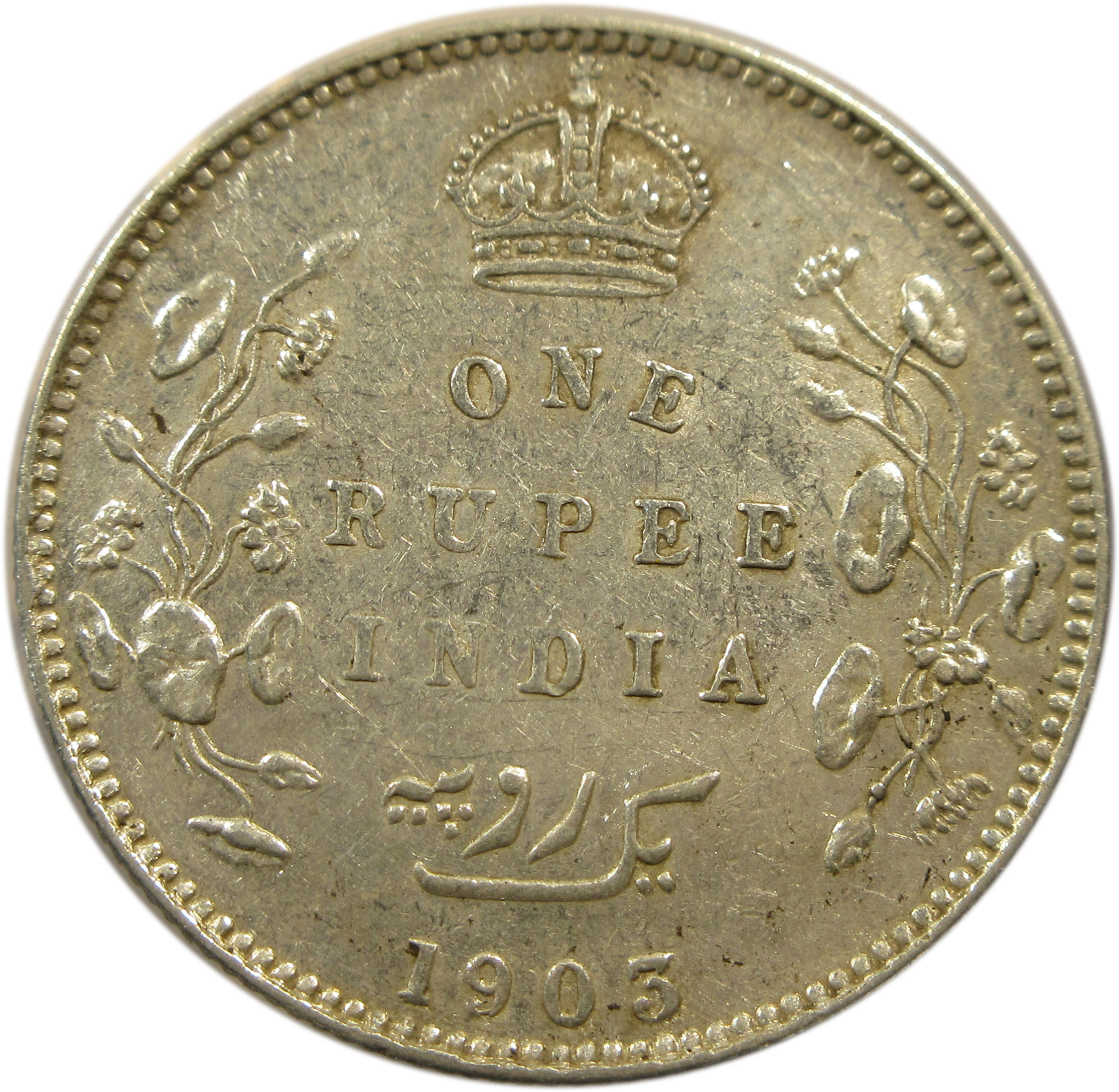 Reverse: Crown/1 RUPEE/INDIA/Yek Rupiya(1 Rupee in Urdu)/1903, surrounded by a spray of a Lotus flora in each side. The value in English and Persian; all within a raised ,toothed border.