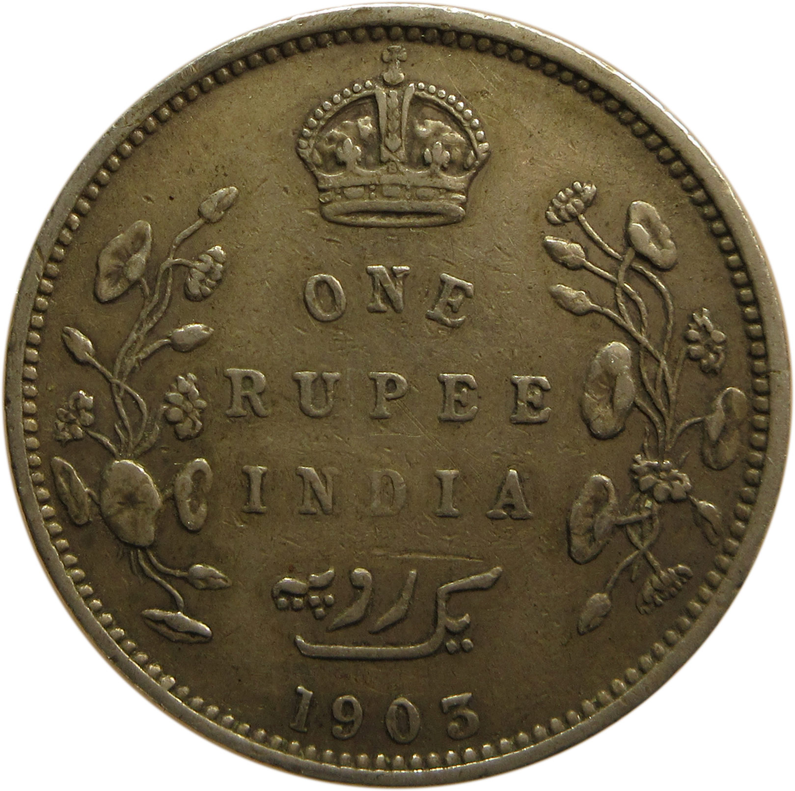 Reverse: Crown/1 RUPEE/INDIA/Yek Rupiya(1 Rupee in Urdu)/1907, surrounded by a spray of a Lotus flora in each side. The value in English and Persian; all within a raised ,toothed border.