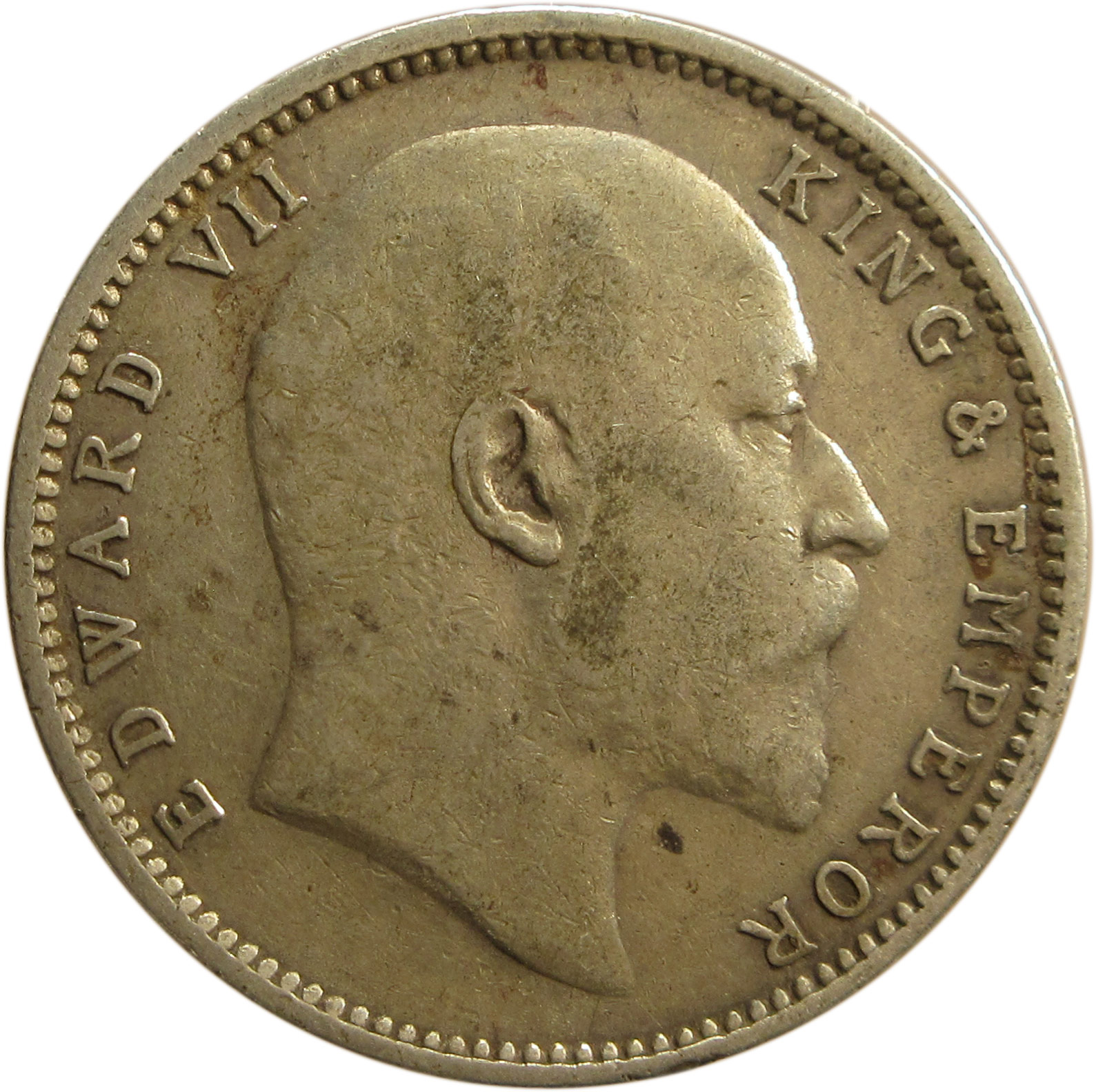 Obverse: Bare headed bust of the King Facing right. EDWARD VII KING AND EMPEROR legend around the bust. All within a Raised, Toothed Rim.