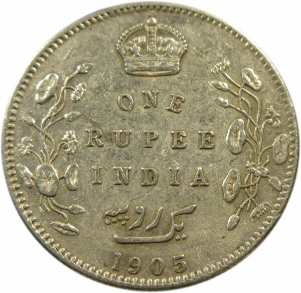 Reverse: Crown/1 RUPEE/INDIA/Yek Rupiya(1 Rupee in Urdu)/1905, surrounded by a spray of a Lotus flora in each side. The value in English and Persian; all within a raised ,toothed border.