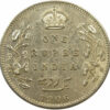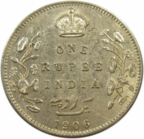 Reverse: Crown/1 RUPEE/INDIA/Yek Rupiya(1 Rupee in Urdu)/1906, surrounded by a spray of a Lotus flora in each side. The value in English and Persian; all within a raised ,toothed border.