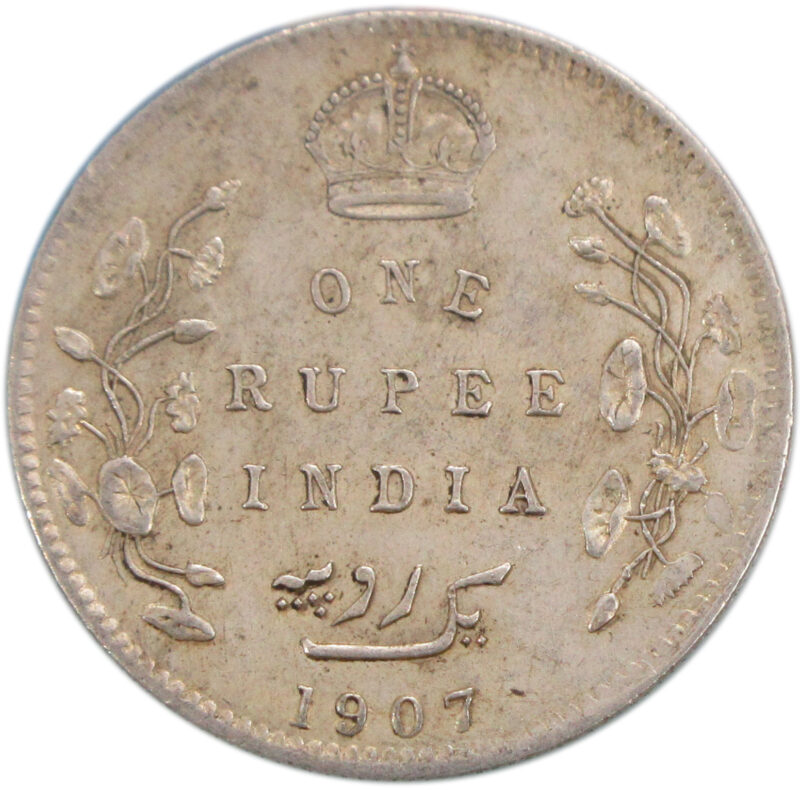 Reverse: Crown/1 RUPEE/INDIA/Yek Rupiya(1 Rupee in Urdu)/1907, surrounded by a spray of a Lotus flora in each side. The value in English and Persian; all within a raised ,toothed border.