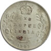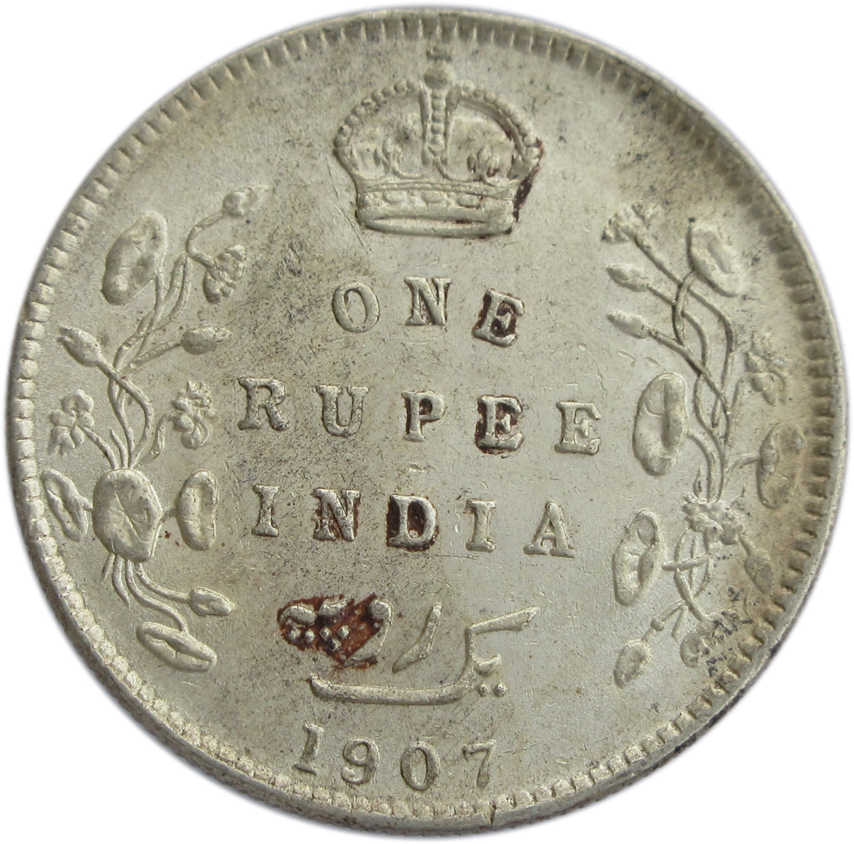Reverse: Crown/1 RUPEE/INDIA/Yek Rupiya(1 Rupee in Urdu)/1907, surrounded by a spray of a Lotus flora in each side. The value in English and Persian; all within a raised ,toothed border.