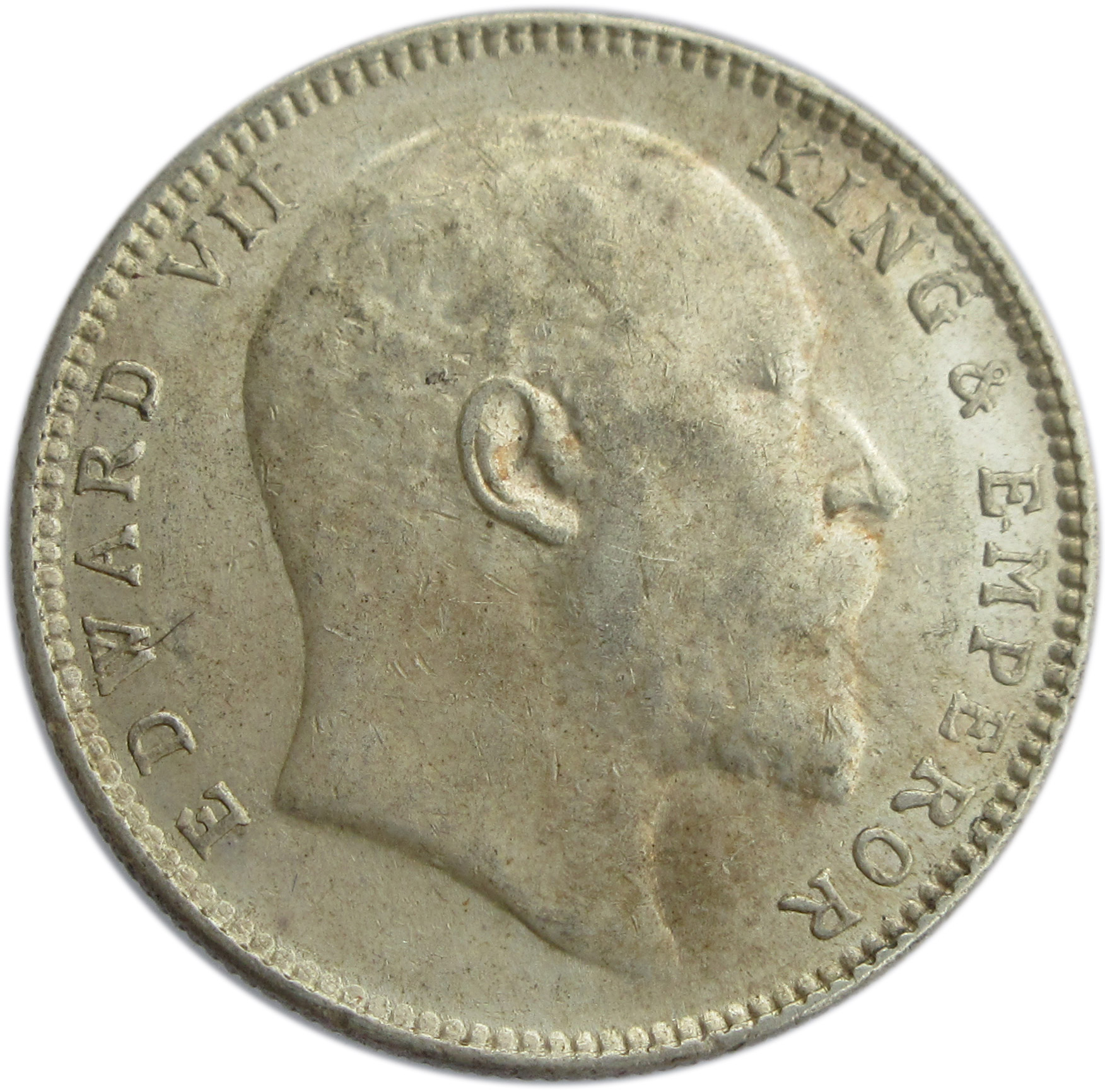 Obverse: Bare headed bust of the King Facing right. EDWARD VII KING AND EMPEROR legend around the bust. All within a Raised, Toothed Rim.