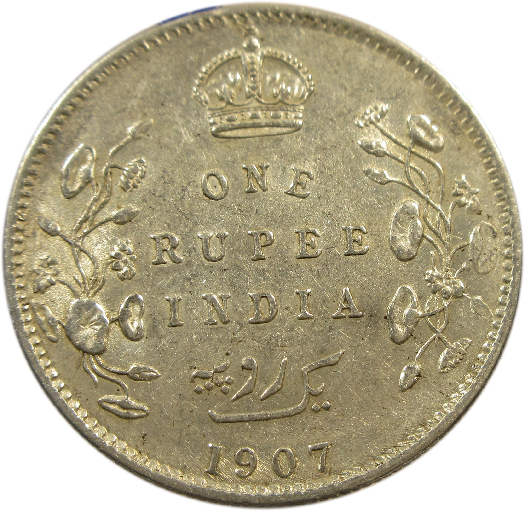 Reverse: Crown/1 RUPEE/INDIA/Yek Rupiya(1 Rupee in Urdu)/1907, surrounded by a spray of a Lotus flora in each side. The value in English and Persian; all within a raised ,toothed border.