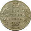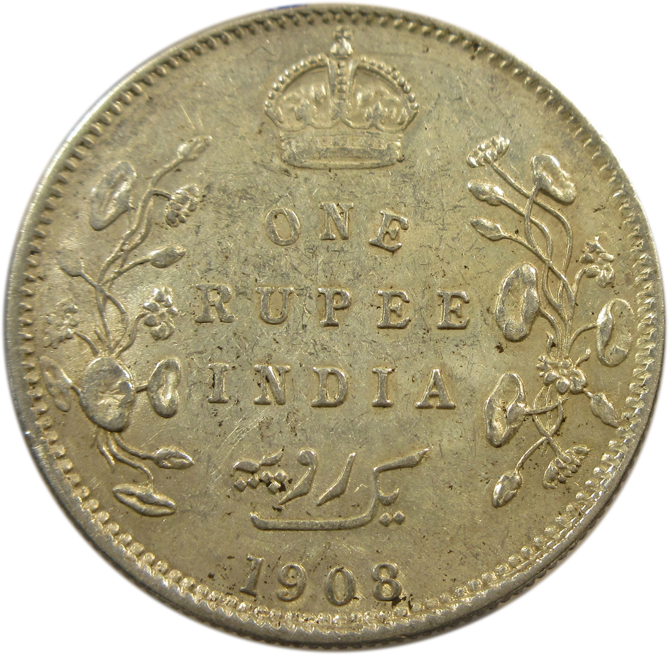 Reverse: Crown/1 RUPEE/INDIA/Yek Rupiya(1 Rupee in Urdu)/1908, surrounded by a spray of a Lotus flora in each side. The value in English and Persian; all within a raised ,toothed border.