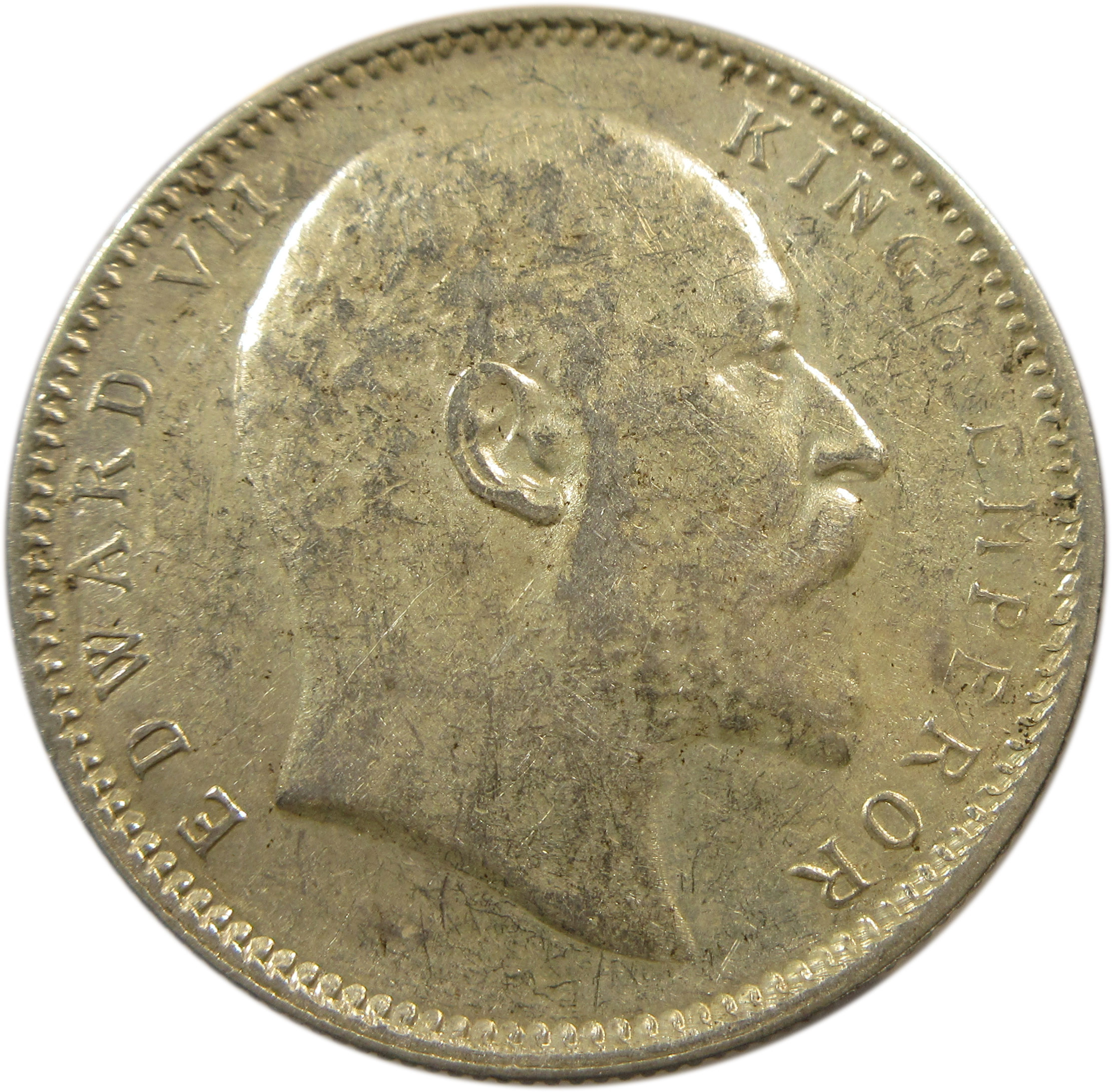 Obverse: Bare headed bust of the King Facing right. EDWARD VII KING AND EMPEROR legend around the bust. All within a Raised, Toothed Rim.