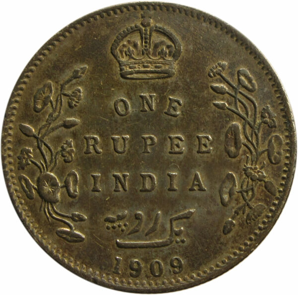 Reverse: Crown/1 RUPEE/INDIA/Yek Rupiya(1 Rupee in Urdu)/1909, surrounded by a spray of a Lotus flora in each side. The value in English and Persian; all within a raised ,toothed border.