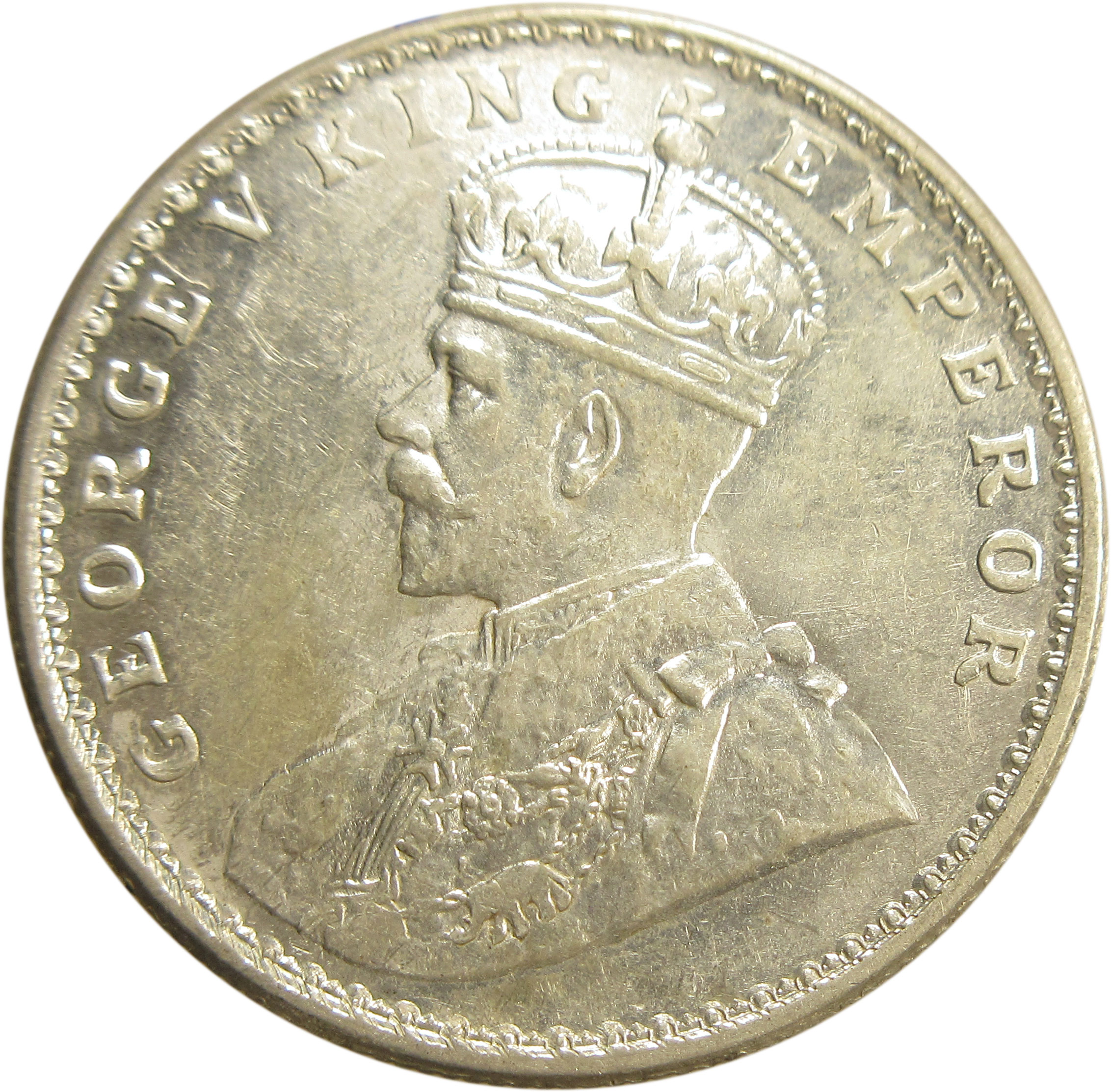 Obverse: Crowned and robed bust of King George V facing left with Legends GEORGE V KING EMPEROR around it.