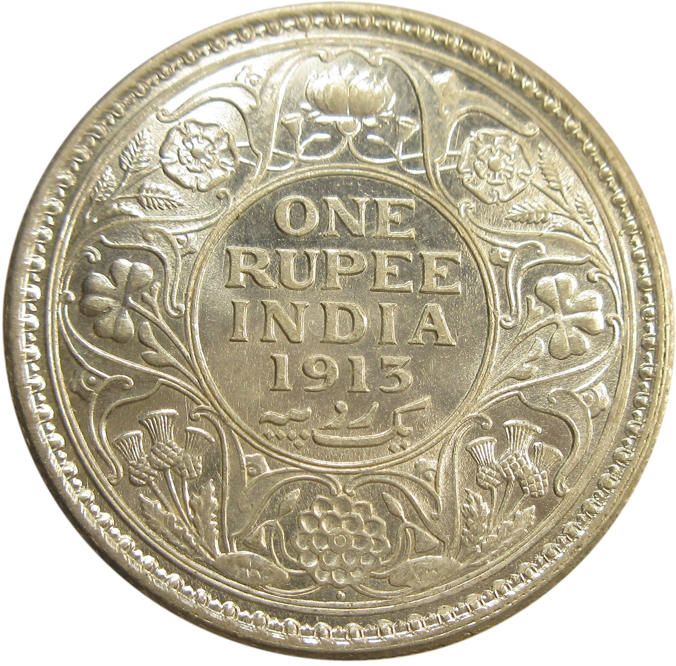 Reverse: ONE RUPEE/INDIA/1913/Yek Rupiya within a double-line circle, surrounded by a scroll composed of a rose, thistle & shamrock. The Indian Lotus is placed at the top and bottom; all within a toothed border an another double-line circle.