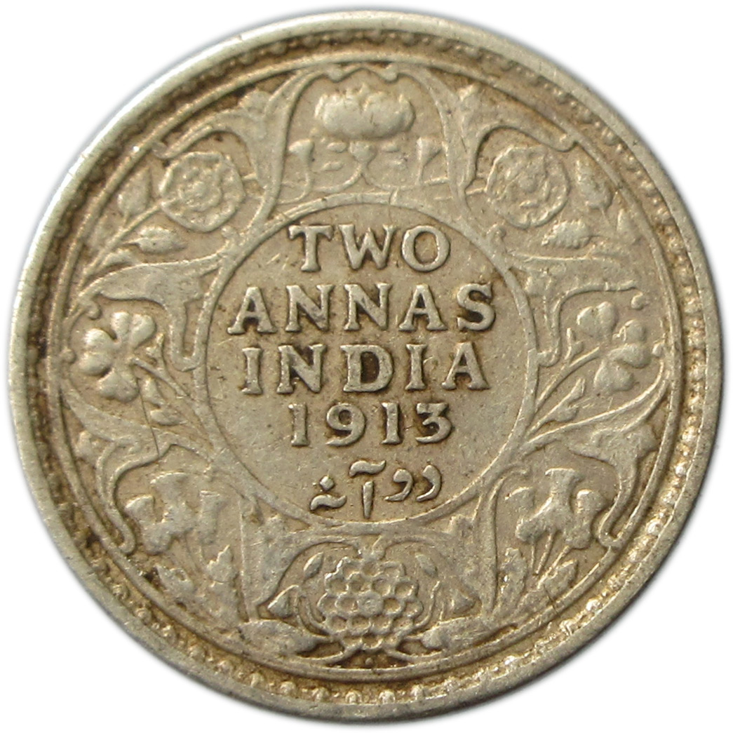 Reverse: TWO ANNAS/INDIA/1913/DO ANA within a double-line circle, surrounded by a scroll composed of a rose, thistle & shamrock. The Indian Lotus is placed at the top and bottom; all within a toothed border an another double-line circle.