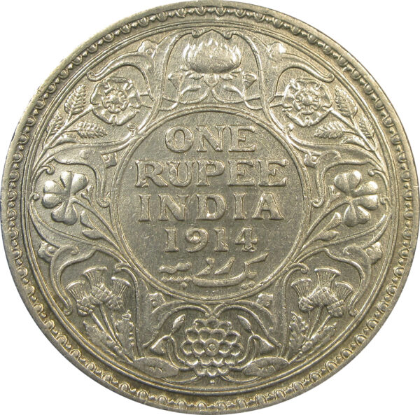 Reverse: ONE RUPEE/INDIA/1914/Yek Rupiya within a double-line circle, surrounded by a scroll composed of a rose, thistle & shamrock. The Indian Lotus is placed at the top and bottom; all within a toothed border an another double-line circle.