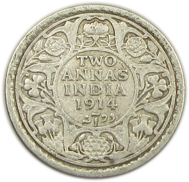 Reverse: TWO ANNAS/INDIA/1914/DO ANA within a double-line circle, surrounded by a scroll composed of a rose, thistle & shamrock. The Indian Lotus is placed at the top and bottom; all within a toothed border an another double-line circle.