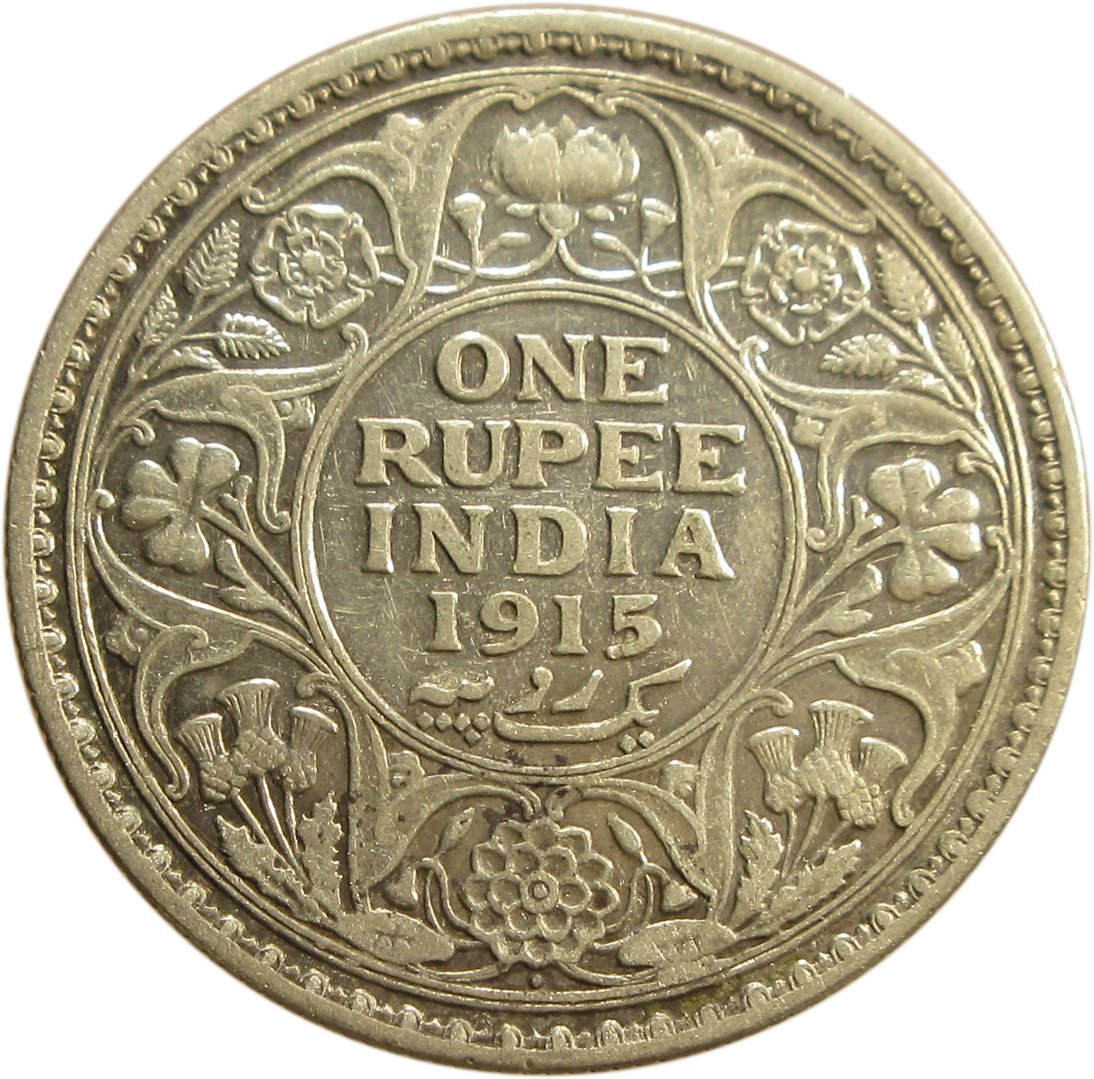 Reverse: ONE RUPEE/INDIA/1915/Yek Rupiya within a double-line circle, surrounded by a scroll composed of a rose, thistle & shamrock. The Indian Lotus is placed at the top and bottom; all within a toothed border an another double-line circle.