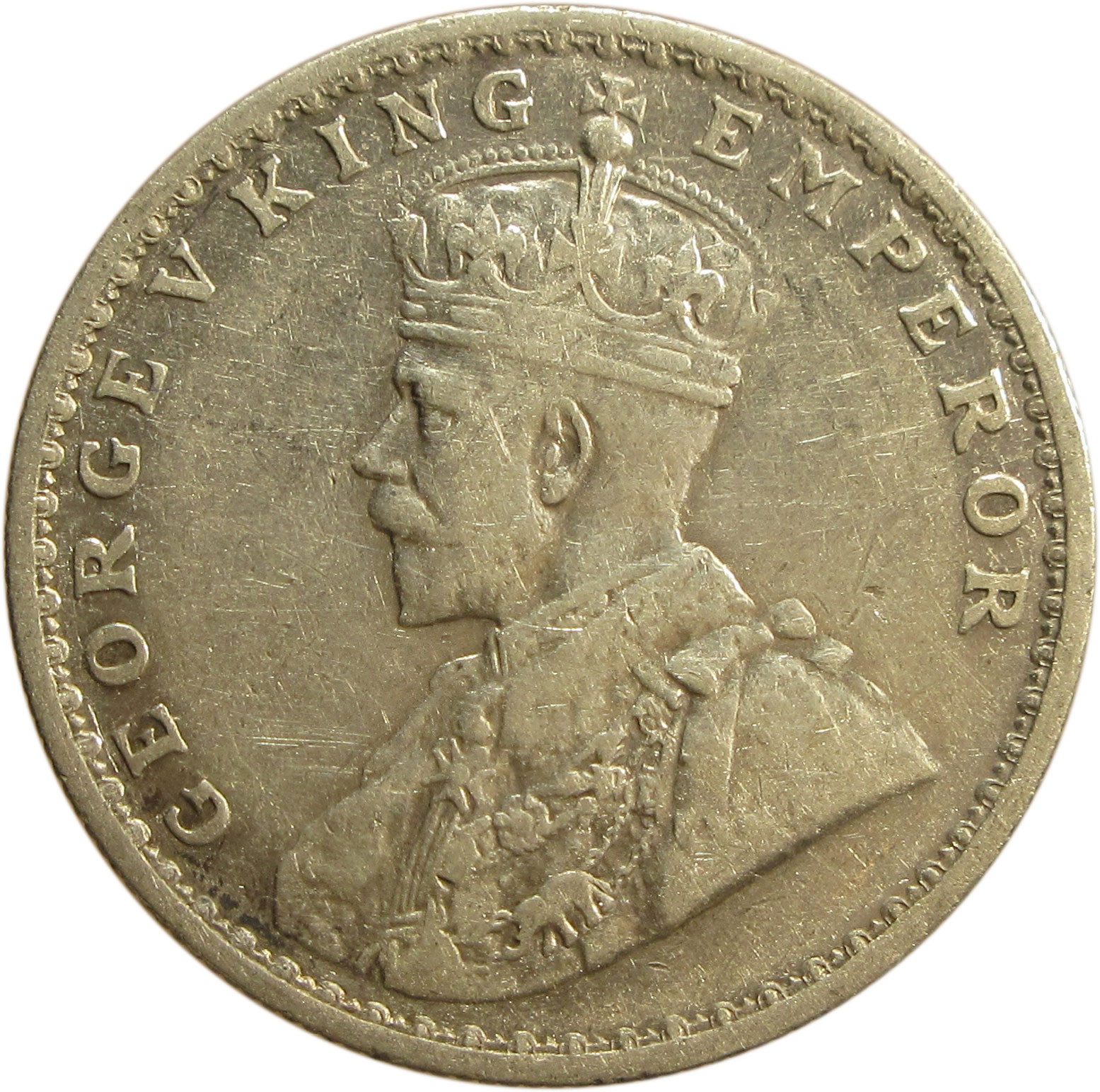 Obverse: Crowned and robed bust of King George V facing left with Legends GEORGE V KING EMPEROR around it.