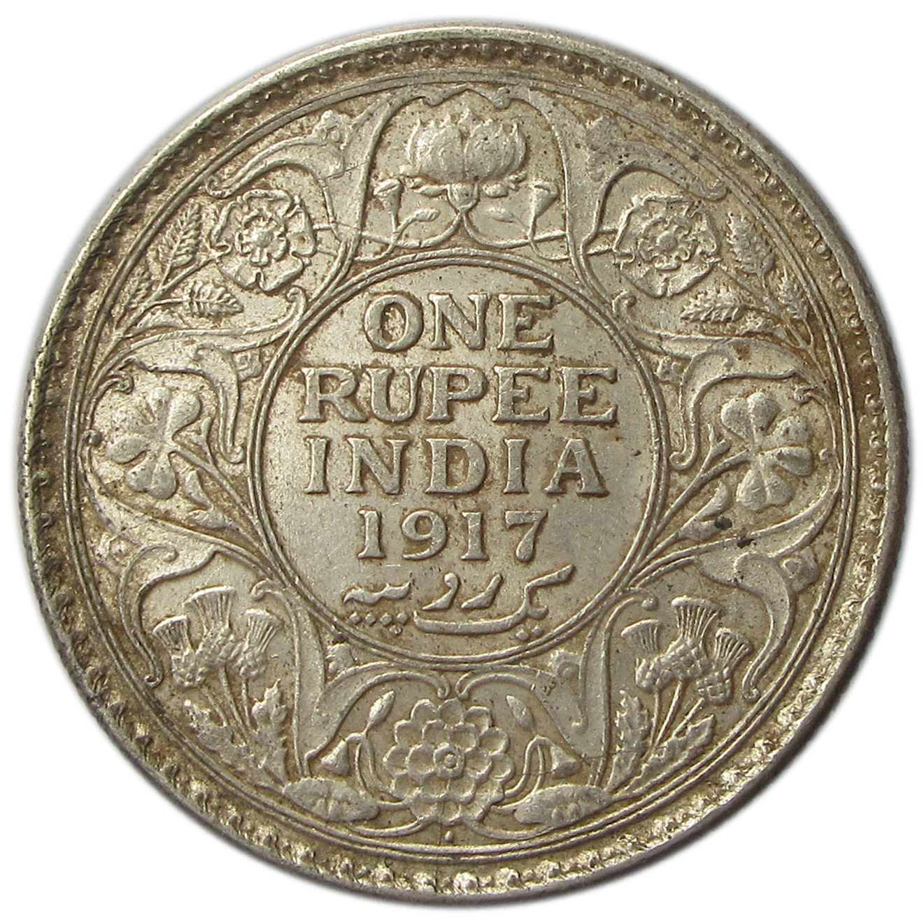 Reverse: ONE RUPEE/INDIA/1917/Yek Rupiya within a double-line circle, surrounded by a scroll composed of a rose, thistle & shamrock. The Indian Lotus is placed at the top and bottom; all within a toothed border an another double-line circle.