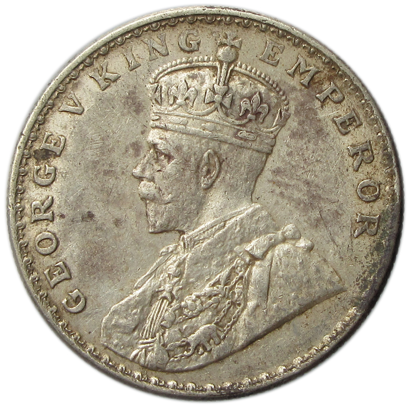 Obverse: Crowned and robed bust of King George V facing left with Legends GEORGE V KING EMPEROR around it.