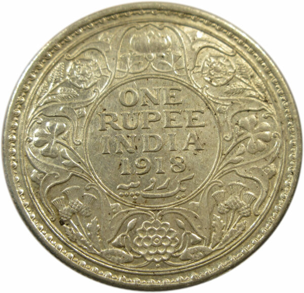 Reverse: ONE RUPEE/INDIA/1918/Yek Rupiya within a double-line circle, surrounded by a scroll composed of a rose, thistle & shamrock. The Indian Lotus is placed at the top and bottom; all within a toothed border an another double-line circle.