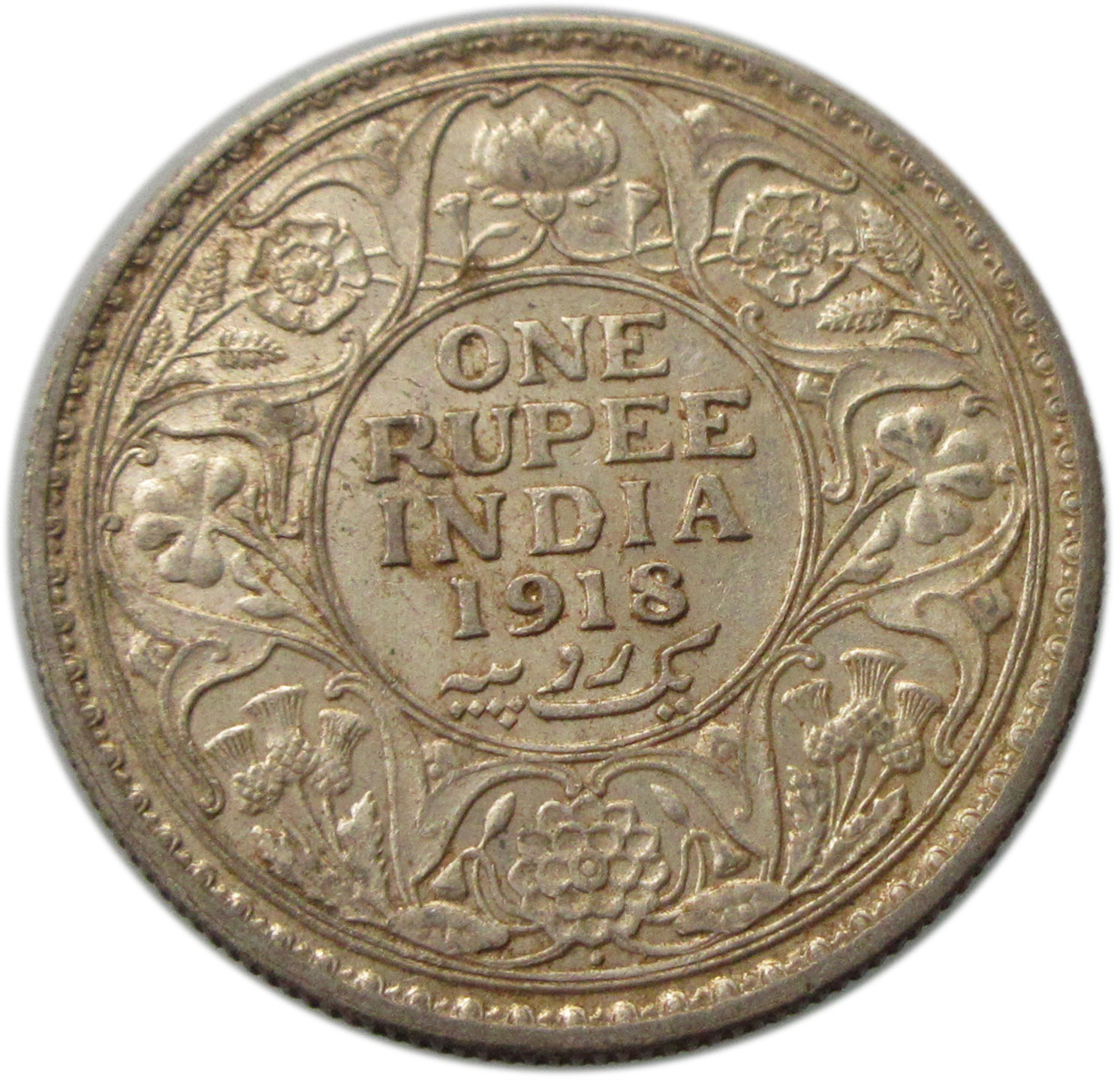 Reverse: ONE RUPEE/INDIA/1918/Yek Rupiya within a double-line circle, surrounded by a scroll composed of a rose, thistle & shamrock. The Indian Lotus is placed at the top and bottom; all within a toothed border an another double-line circle.