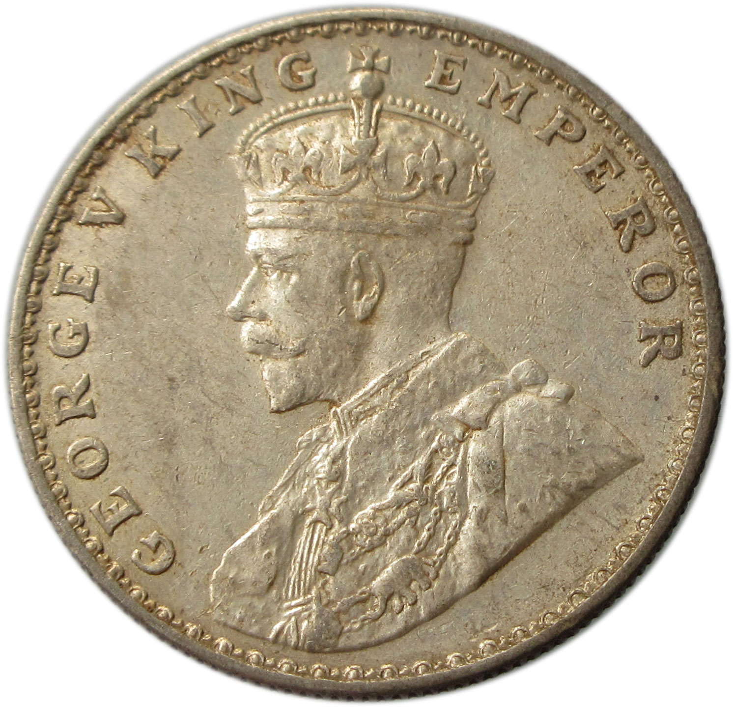 Obverse: Crowned and robed bust of King George V facing left with Legends GEORGE V KING EMPEROR around it.