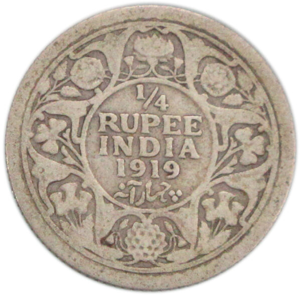 Reverse: 1/4 RUPEE/INDIA/1919/Chahar Ana within a double-line circle, surrounded by a scroll composed of a rose, thistle & shamrock. The Indian Lotus is placed at the top and bottom; all within a toothed border an another double-line circle.