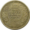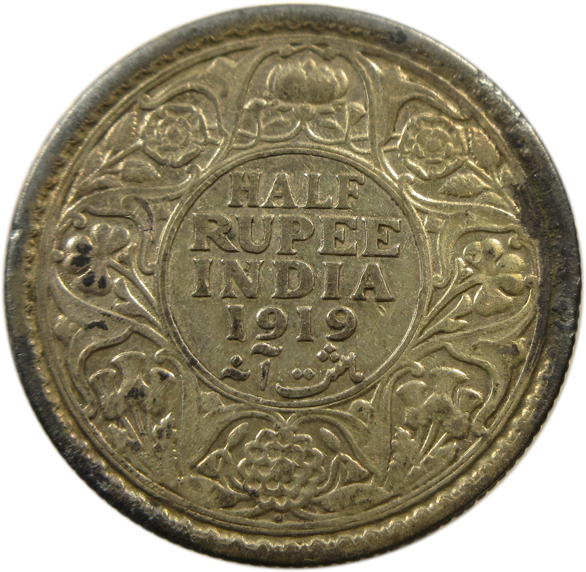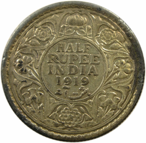Reverse: HALF RUPEE/INDIA/1919/Hasht Ana within a double-line circle, surrounded by a scroll composed of a rose, thistle & shamrock. The Indian Lotus is placed at the top and bottom; all within a toothed border an another double-line circle.