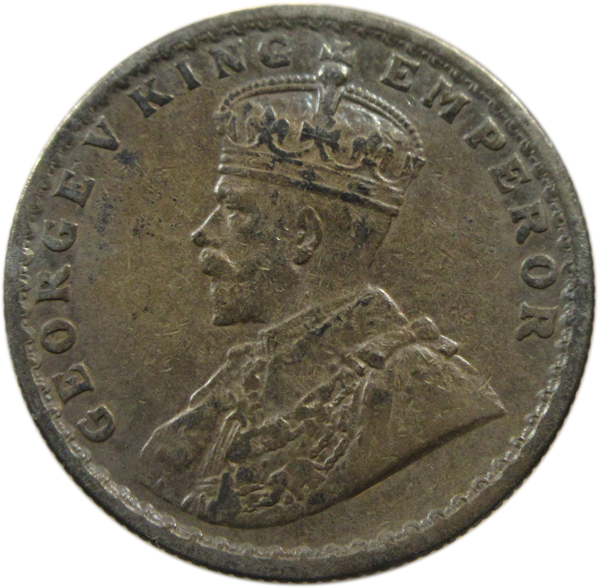 Obverse: Crowned and robed bust of King George V facing left with Legends GEORGE V KING EMPEROR around it.
