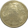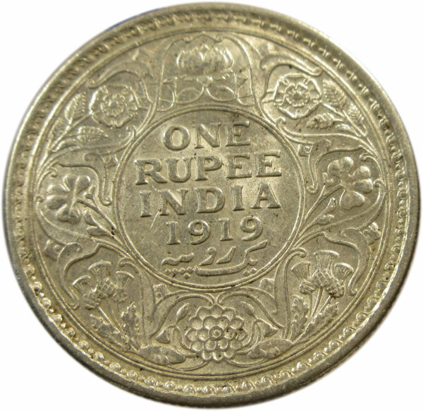 Reverse: ONE RUPEE/INDIA/1919/Yek Rupiya within a double-line circle, surrounded by a scroll composed of a rose, thistle & shamrock. The Indian Lotus is placed at the top and bottom; all within a toothed border an another double-line circle.