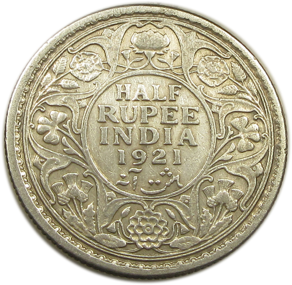 Reverse: HALF RUPEE/INDIA/1921/Hasht Ana within a double-line circle, surrounded by a scroll composed of a rose, thistle & shamrock. The Indian Lotus is placed at the top and bottom; all within a toothed border an another double-line circle.