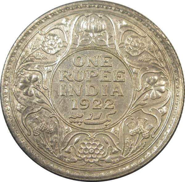 Reverse: ONE RUPEE/INDIA/1922/Yek Rupiya within a double-line circle, surrounded by a scroll composed of a rose, thistle & shamrock. The Indian Lotus is placed at the top and bottom; all within a toothed border an another double-line circle.